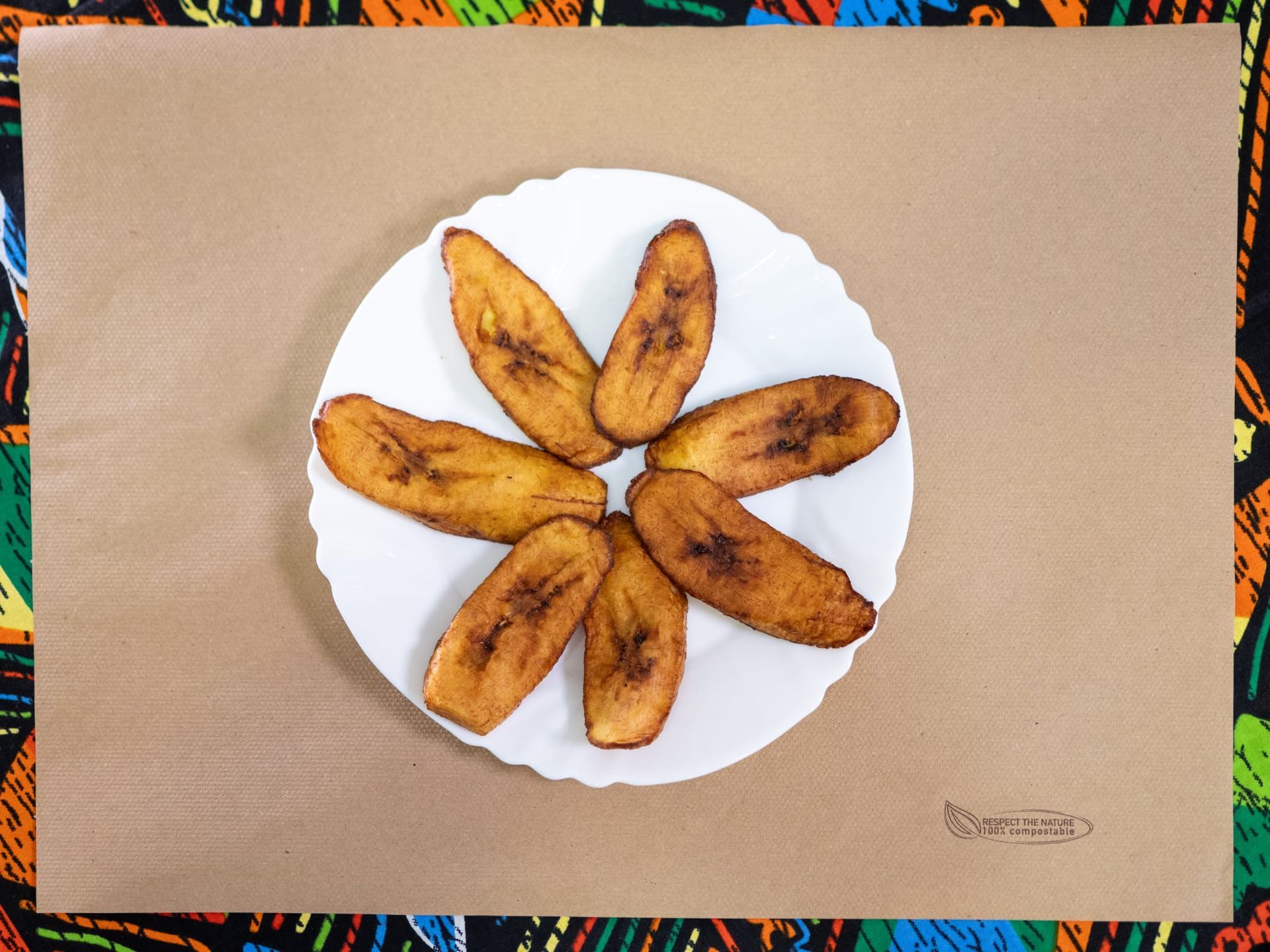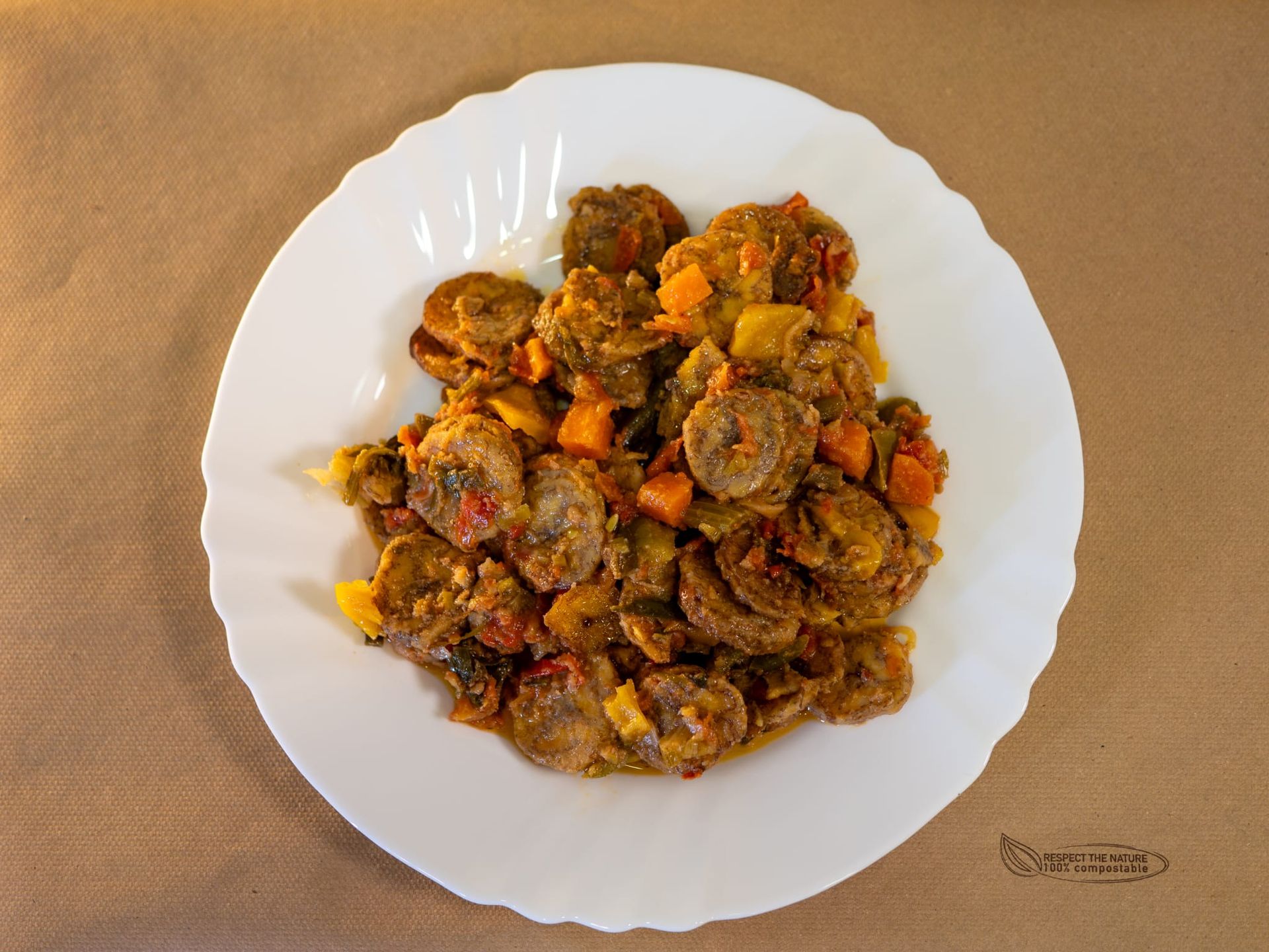 Il colore giallo proviene dall'olio di palma non raffinato che non si può sostituire con altro tipo di olio. Lo proponiamo con platano maturo al vapore.